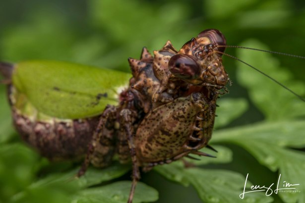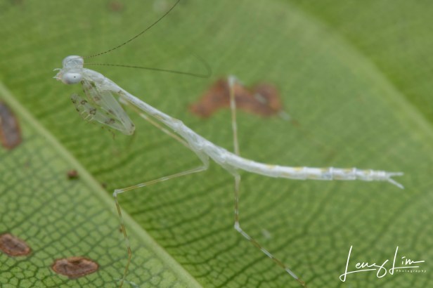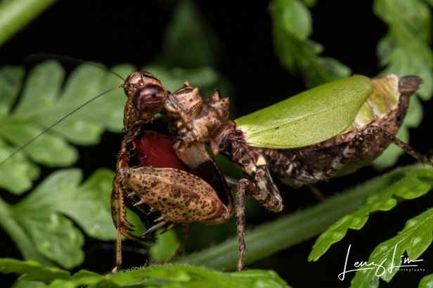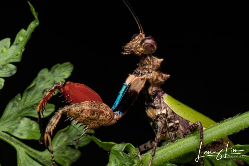 Look at all those spikes! While shooting this mantis, we noticed that only at a certain angle, a beautiful iridescent blue can be seen on the inner-side of her front legs. Took a long time getting the shot especially after my focus light died on me~ Check out the results below!