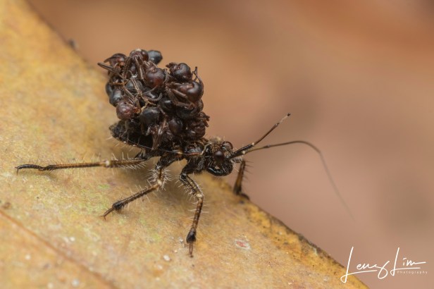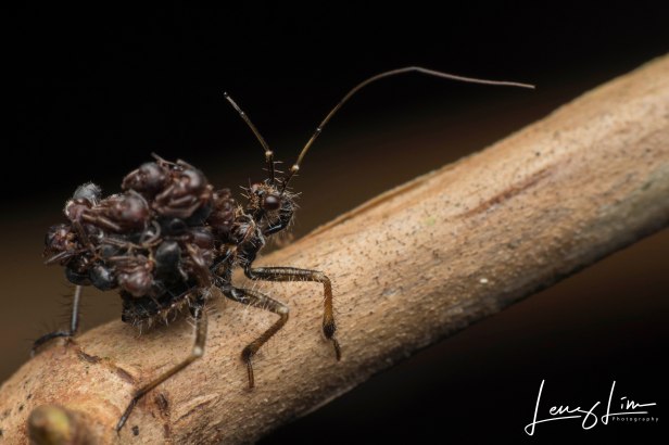 One of the highlights of the night! Finally coming across an Acanthaspis petax when I’m fully equipped with my gear. This Assassin Bug wears the carcasses of its prey by secreting a sticky substance and placing the exoskeletons on top of it. The prey masks the smell of the Assassin bug and enables this predator to live amongst its prey undetected! Absolutely an amazing bug and I had a hard time trying to get the ants in focus as well~ This species has been documented and featured so many times and heres a link to Micro Monsters where you can learn more in a short video (hosted by DavidAttenborough).