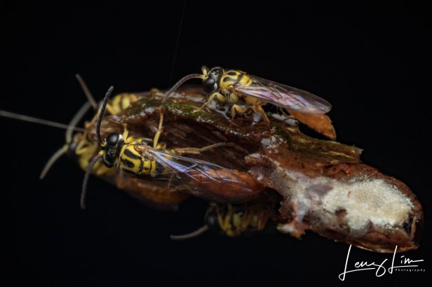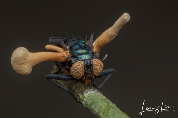 Fly infected with Cordyceps. Should have spent more time with this subject but I was too tired after close to 6 hours of shooting. Tried to get to eye level but the stick was too short and was curved upwards 😦