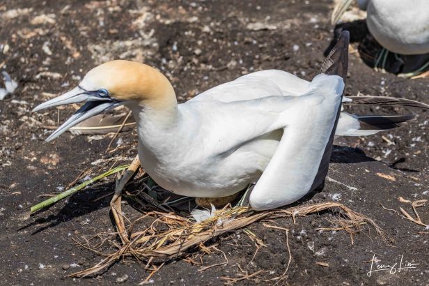The Gannet then lays a single egg and can only successfully incubate one egg over a period of approximately 45 days. Both sexes share the incubation duty, and later brood the chick on the top of their webbed feet.