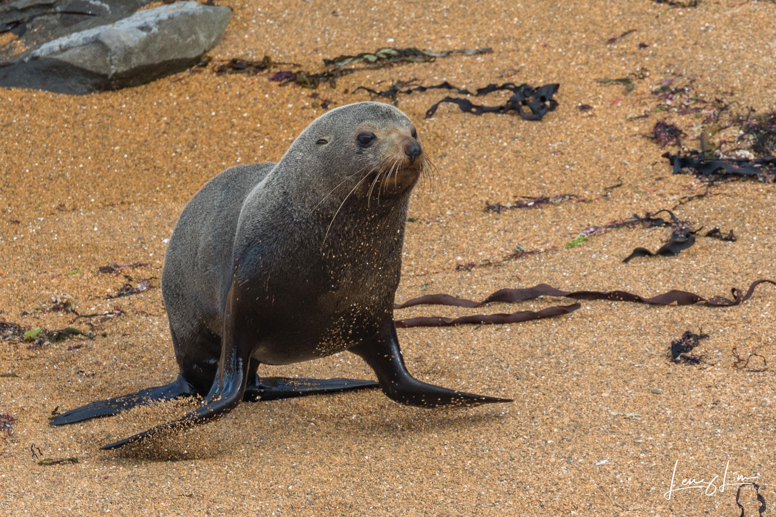 The first animals I spotted were the New Zealand Fur Seals , some carefully camouflaged with the rocks and seaweed on the beach (looking like plump sausages). We saw a great deal of these seals throughout the trip in various locations but the best shots were taken at Katiki. It was almost sunset and the tide forced one of the seals to get up from his slumber and move further into the beach. I was lucky to capture that moment when the seal was thrashing up sand with those flippers!